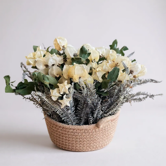 Arranjos frescos, arranjos secos e plantinhas para decorar
