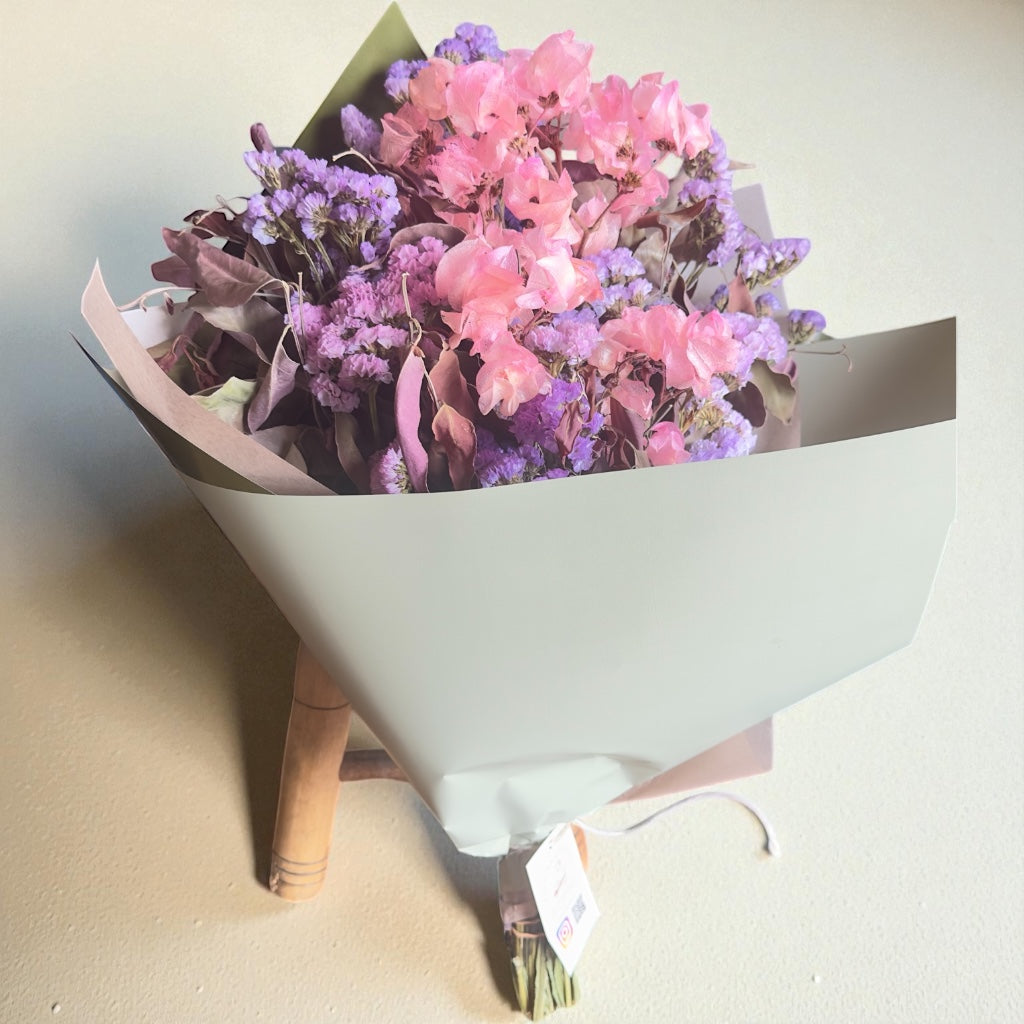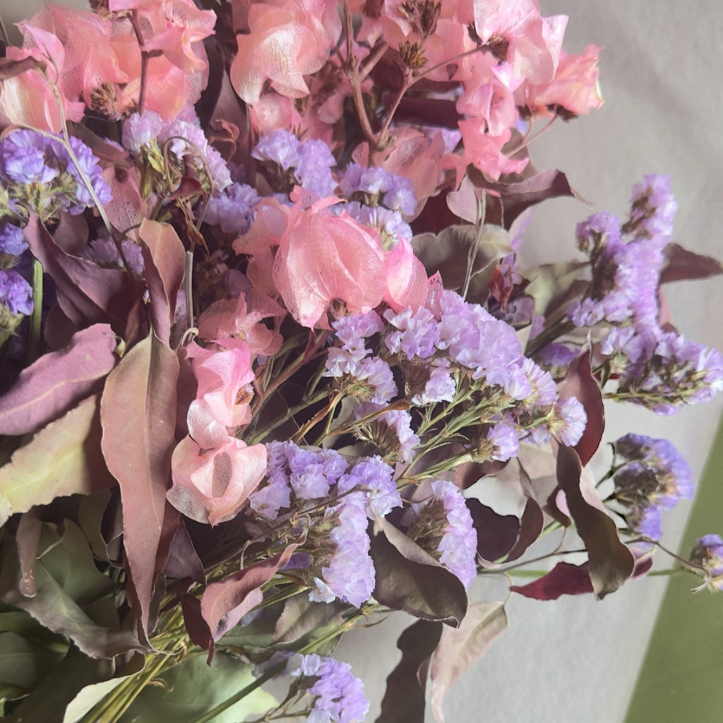 O Amaranto é um arranjo seco com flores em tons suaves de lilás, rosa e verde natural, criando uma composição delicada e romântica.