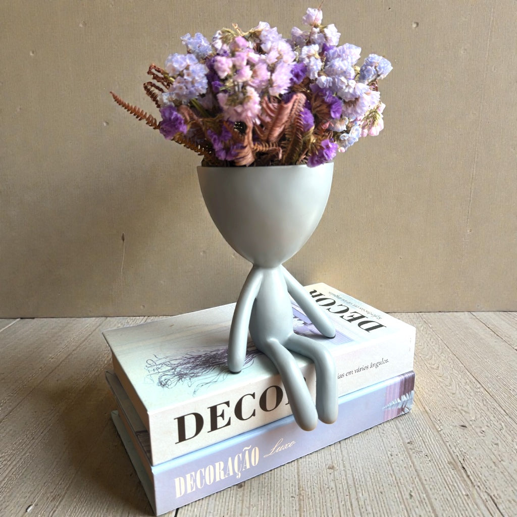 Um vasinho no estilo Bob, em cerâmica cinza fosca, que senta com leveza onde você quiser – mesa de trabalho, prateleira, criado-mudo ou nichos decorativos. No topo, um arranjo 100% natural de samambaia seca com estatices lilás, combinando textura, movimento e suavidade num mini jardim que quase respira por conta própria.
