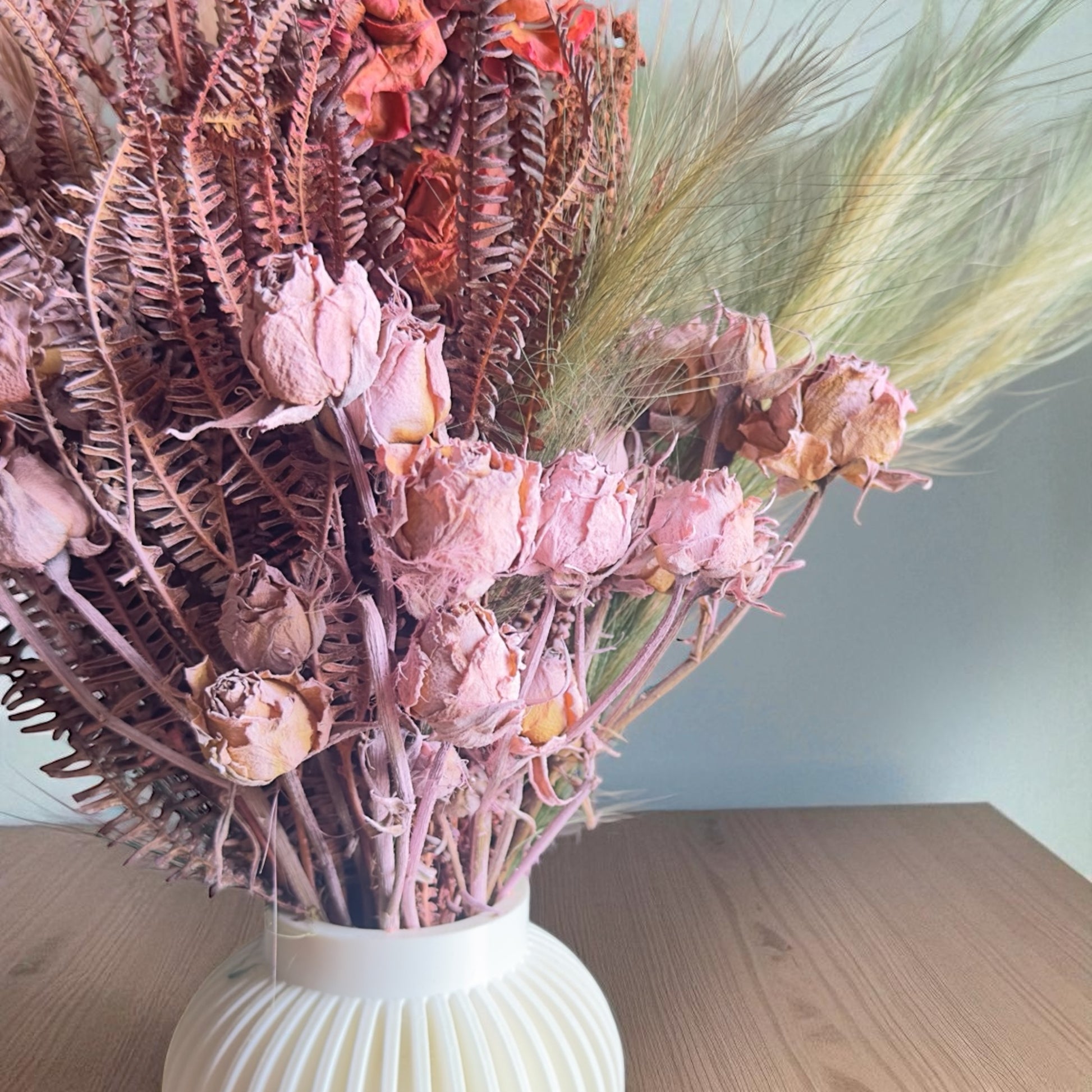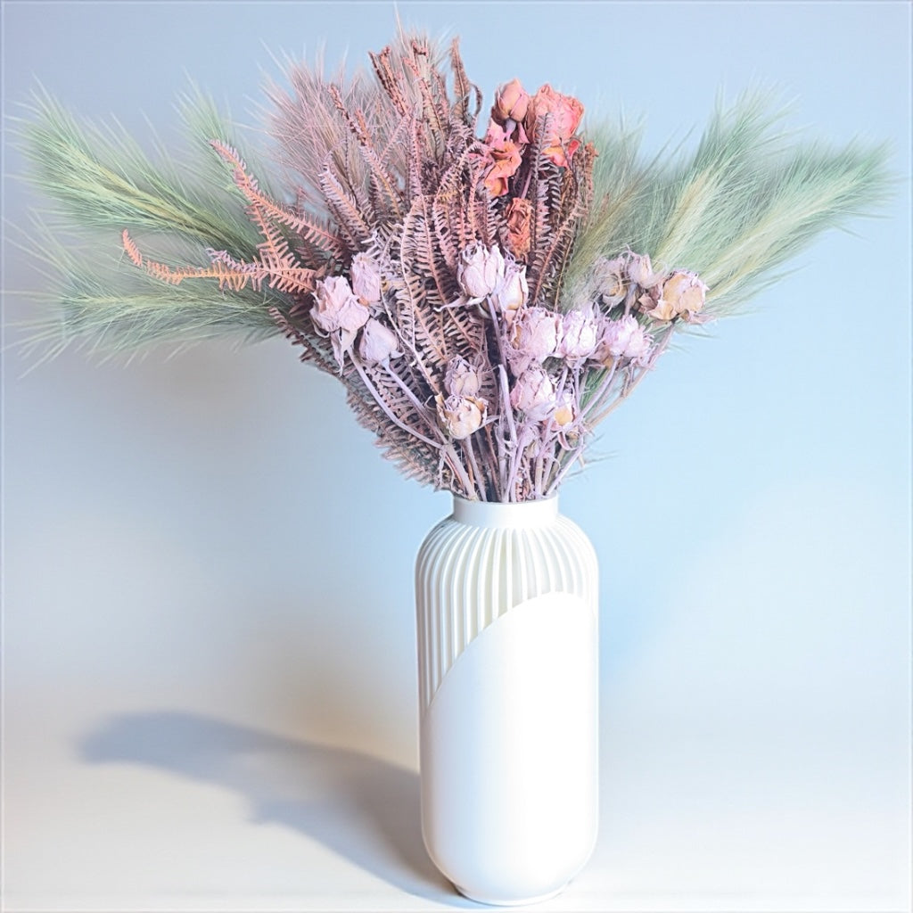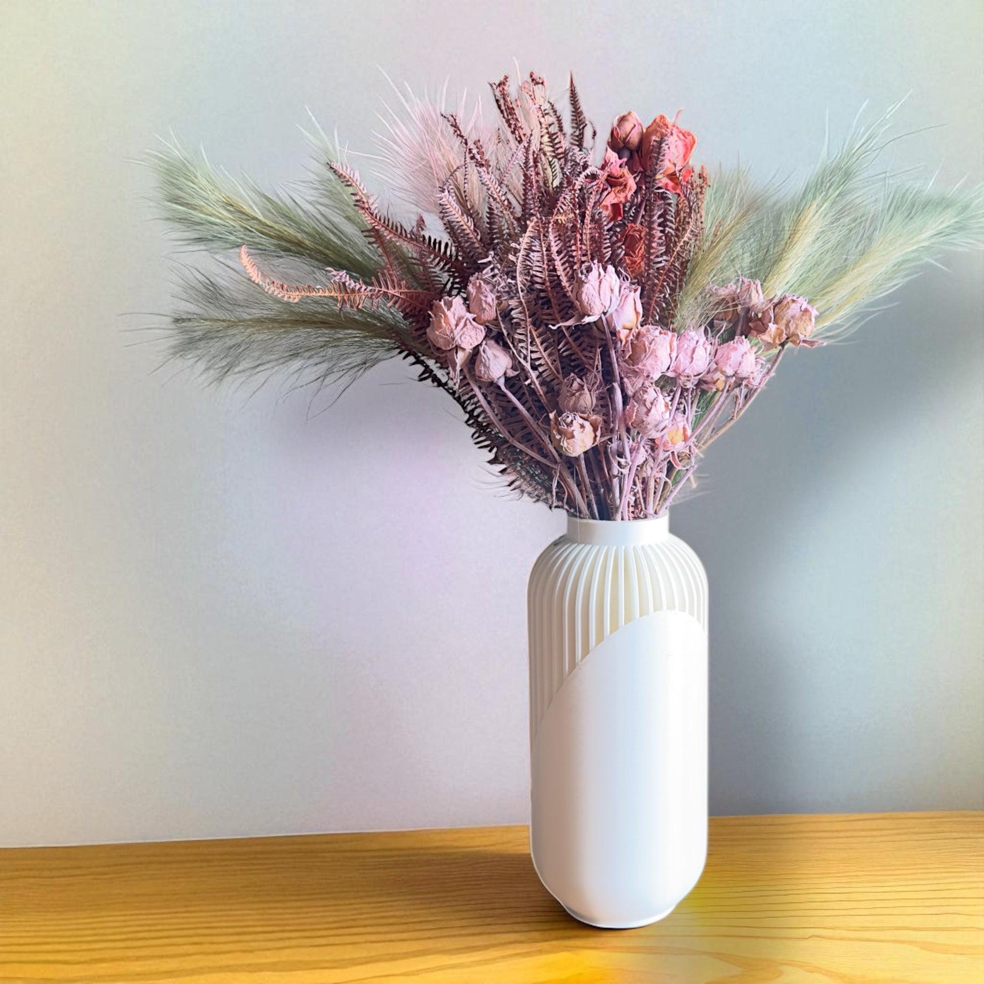 O Brisa Clara é um arranjo seco em vaso de impressão 3D, na cor branca e de design contemporâneo. A composição une mini rosas em tom rosé com capins verdes, criando um contraste suave e elegante — como um sopro de ar fresco entrando pela janela.