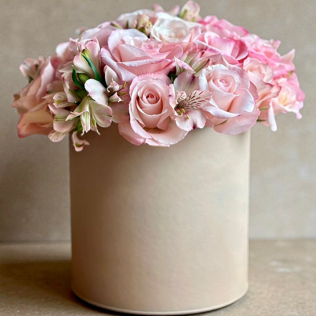 O arranjo é apresentado em box / lata cartonada na cor rosa, que emoldura as flores com discrição e elegância, sem competir com a composição.