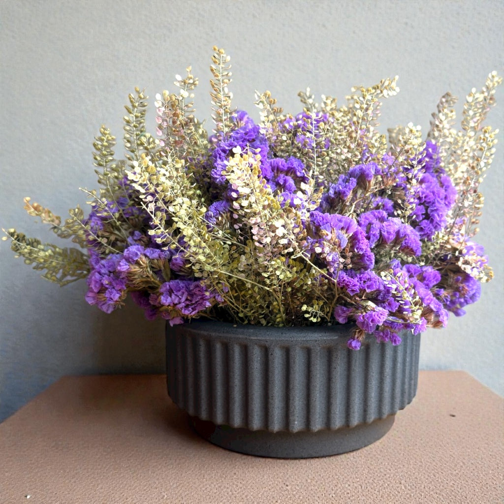 Sobre o vaso Vasarte em tom grafite fosco, a composição une estatices roxas e hastes de sementinha natural, criando um contraste profundo entre o roxo intenso e o verde queimado das folhagens.