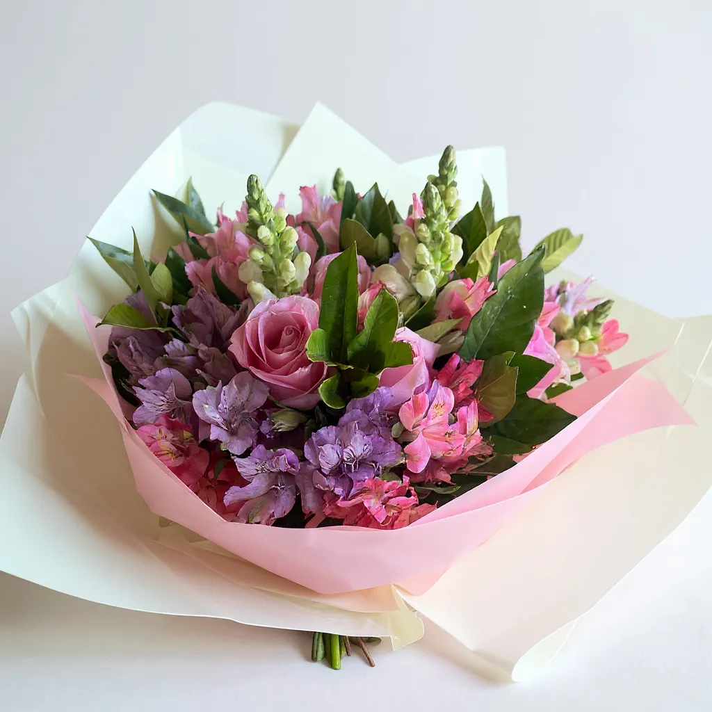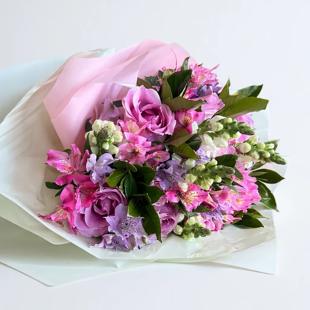 O Encanto é um arranjo autoral que celebra a união do rosa e do lilás em uma harmonia envolvente. Cada peça é única, criada com flores frescas que priorizam qualidade, beleza e durabilidade, sem a promessa de espécies específicas, mas sempre respeitando a paleta de cores.