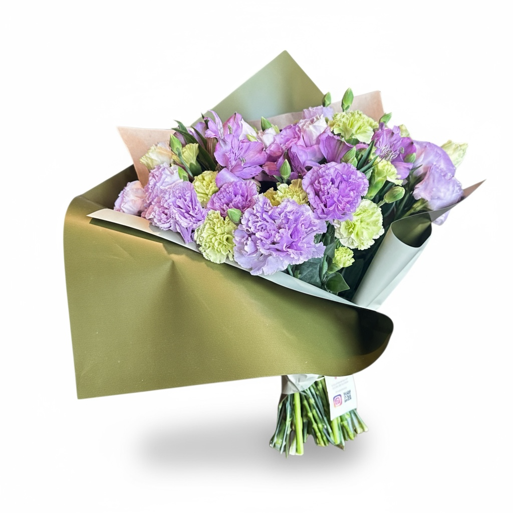 Esse arranjo combina tons suaves de lilás com verde natural, criando uma atmosfera serena e encantadora. Ideal para quem deseja transmitir um toque de delicadeza com um toque de frescor.