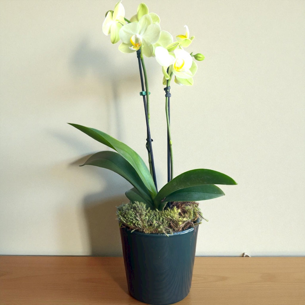 Sutil, fresca e sofisticada — a Orquídea Verde com duas hastes é um arranjo que transmite calma e naturalidade.