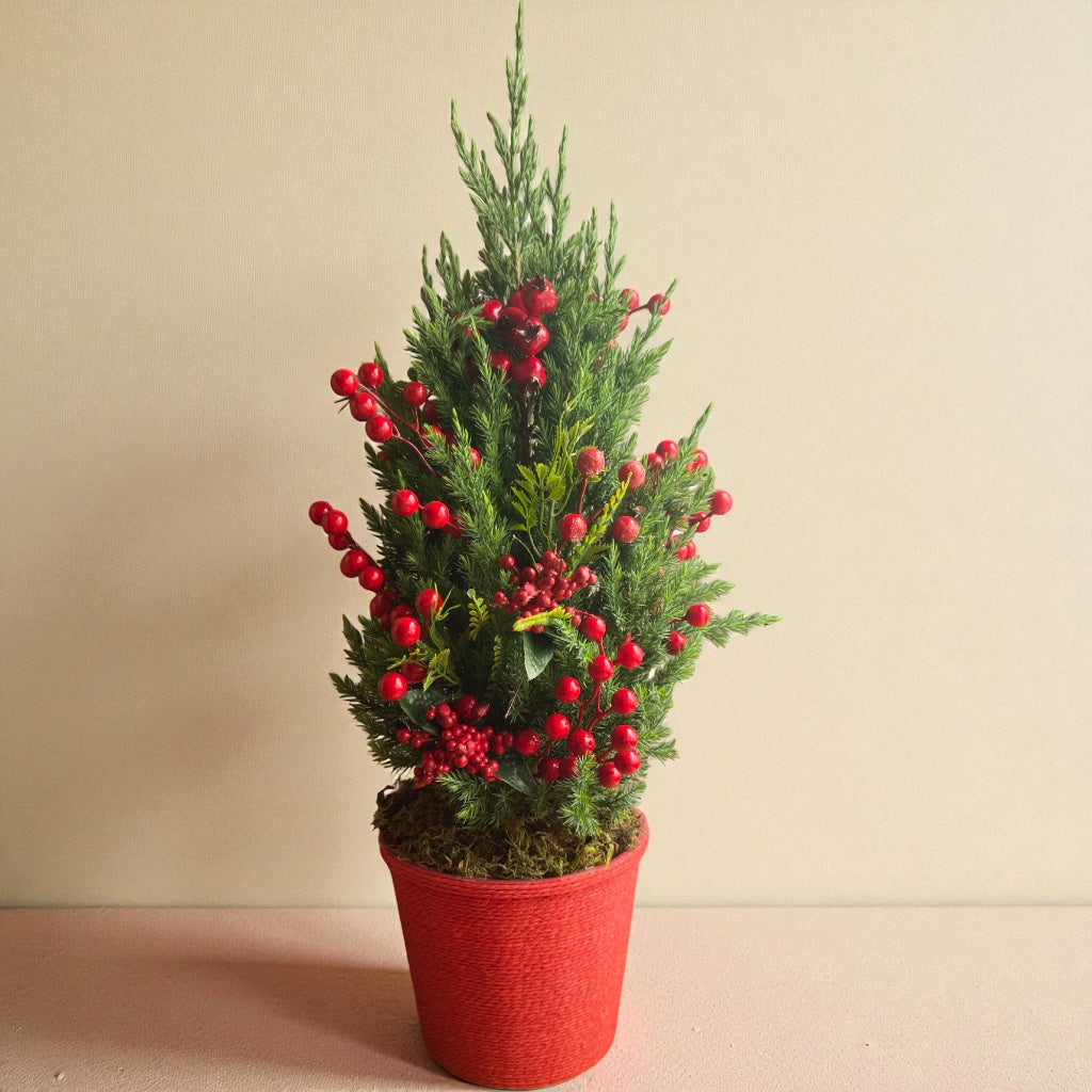 Um pinheiro natural trabalhado à mão, decorado com ramagens festivas e frutos vermelhos que trazem força, brilho e a energia clássica do Natal.