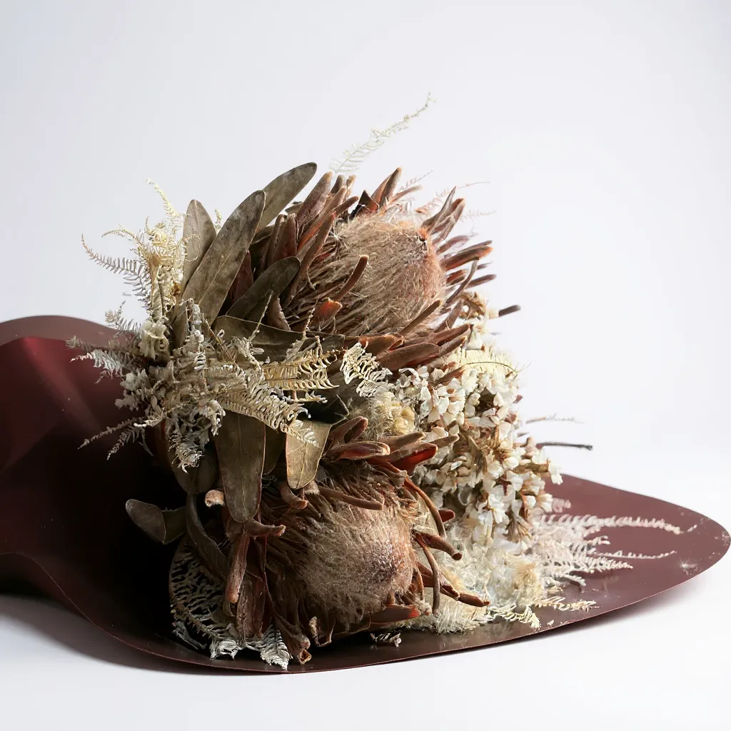 Um arranjo imponente e atemporal, com três hastes de protea seca em destaque, combinadas a folhagens preservadas em tons naturais. O vaso de cerâmica em tom rosé queimado traz sofisticação e torna a peça um ponto de charme para salas, aparadores e ambientes de recepção.