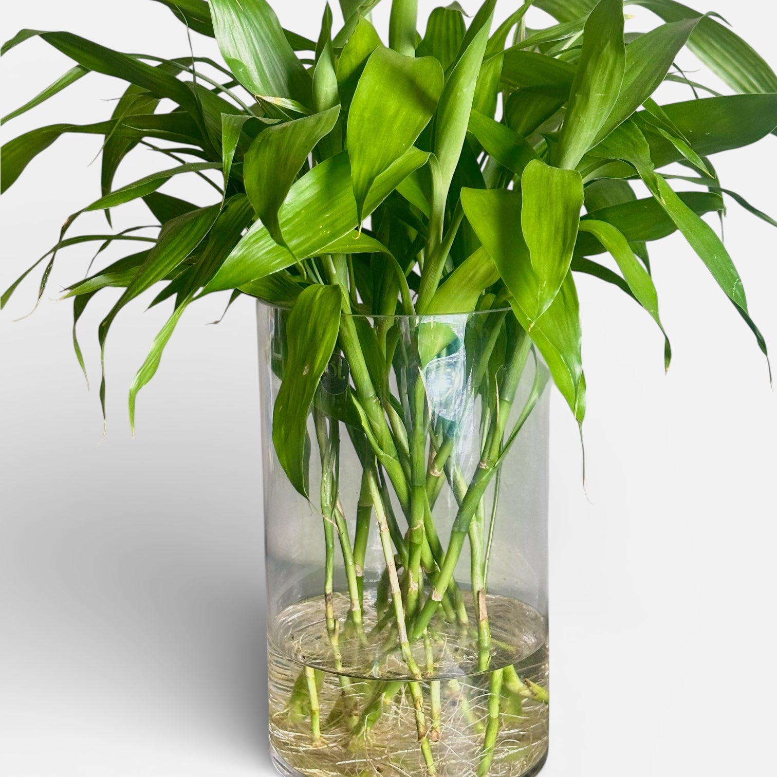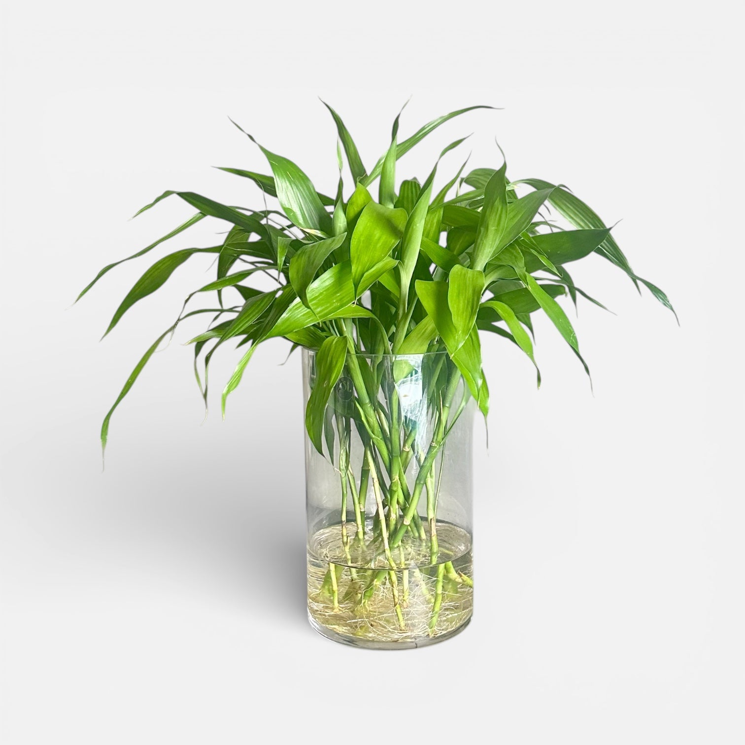 “Sorte, Muita Sorte” é uma composição robusta de bambu-da-sorte cultivado em água, acomodado em vaso cilíndrico de vidro transparente. As múltiplas hastes criam uma presença marcante, cheia de vitalidade e movimento.