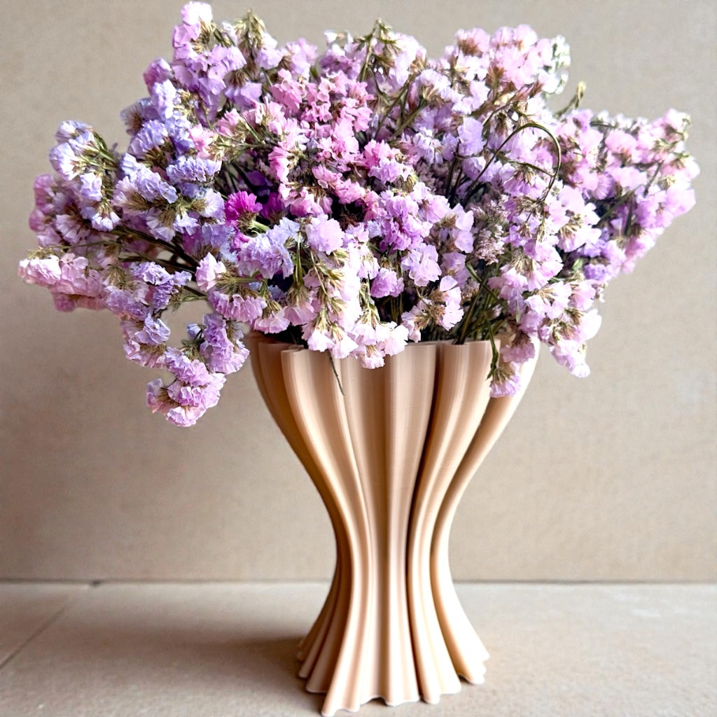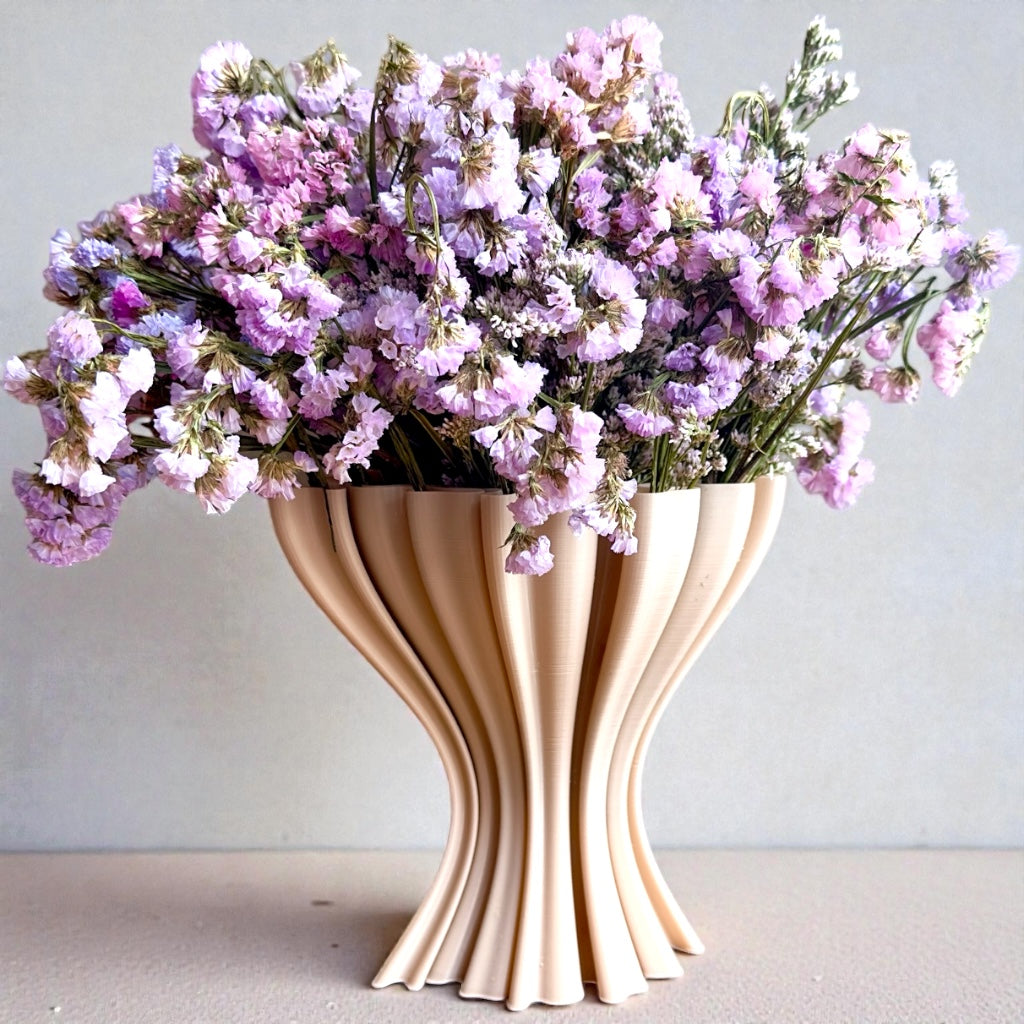 O Sussurro de Areia é um arranjo seco criado para quem aprecia a beleza que fala baixo, mas permanece. Ele combina tons suaves de estatice e limonium — entre o lilás e o rosa claro — em um vaso de impressão 3D na cor areia, com linhas fluidas que parecem esculpidas pelo vento.