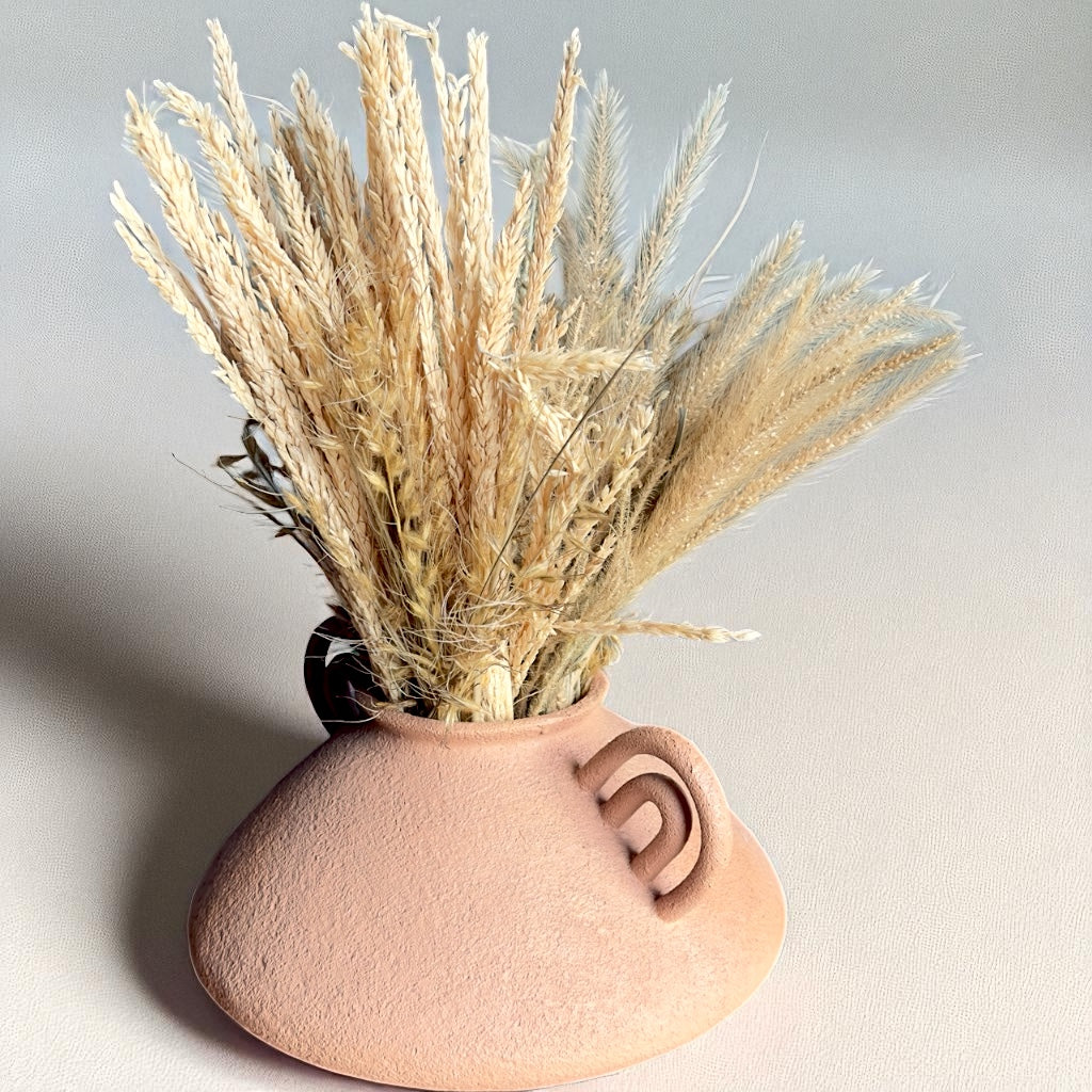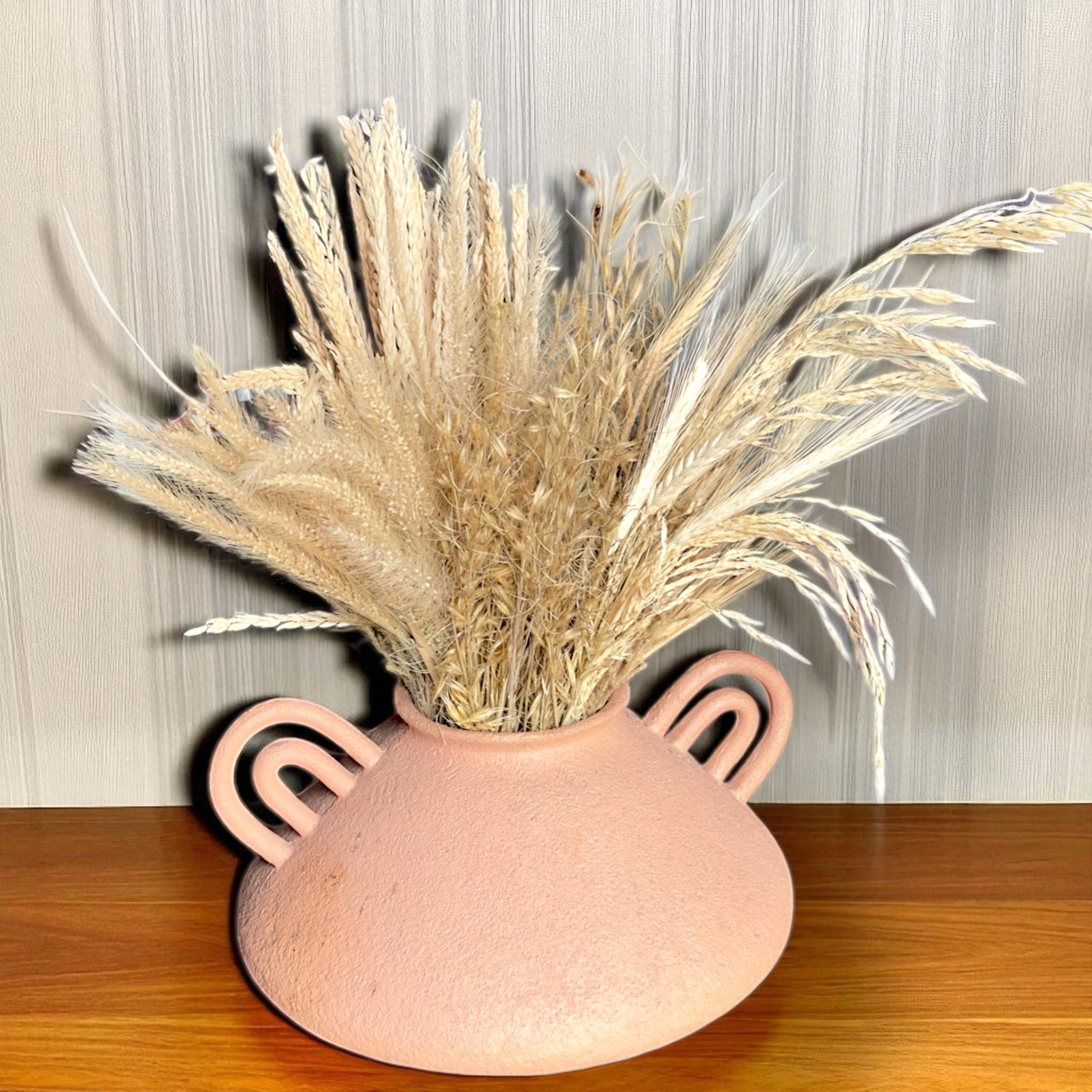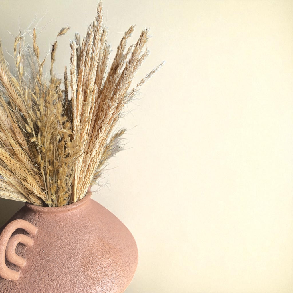 O Tons de Trigo traz uma paleta natural e serena, realçada pelo vaso em tom barro e formato abaulado. Um arranjo de alma campestre — simples, mas cheio de textura — que combina com cozinhas, áreas de descanso e casas de campo.
