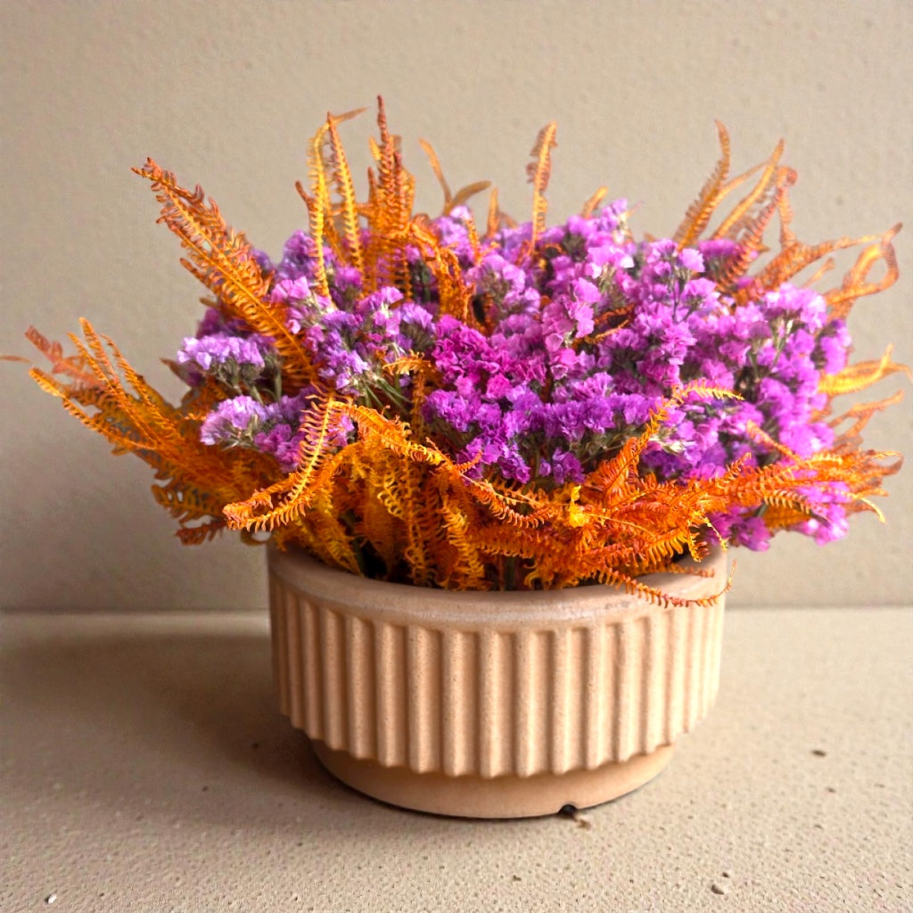 Chama Terracota combina o impacto vibrante das samambaias laranja com a suavidade luminosa das estatices lilás e pink, criando um contraste moderno, ousado e absolutamente irresistível.